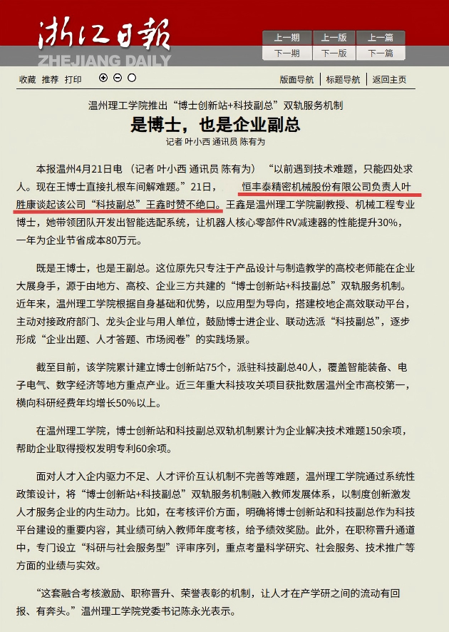 浙江日报 | 温州理工学院推出:“博士创新站+科技副总”双轨服务机制