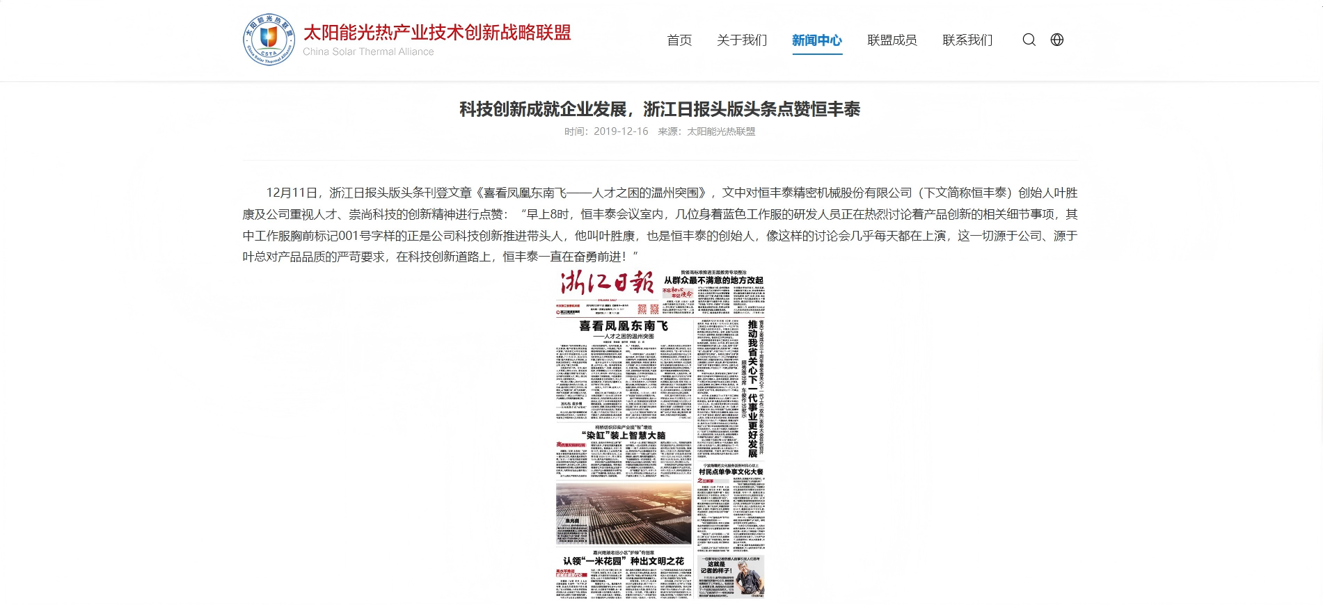 太阳能光热联盟 | 科技创新成就企业发展,浙江日报头版头条点赞恒丰泰